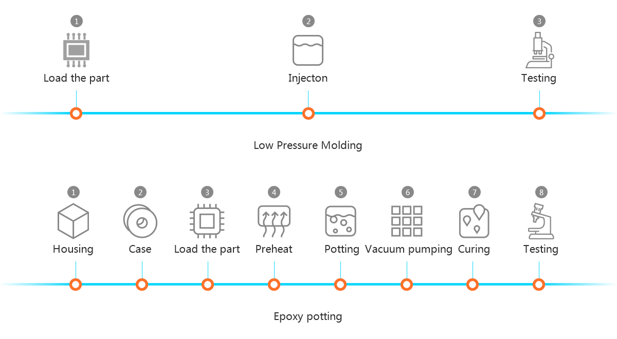 LPMS selects high performance PA hot-melt adhesive, which has excellent mobility. The adhesive takes very small pressure to make it flow to mold, therefore, the products successfully over-molded without causing any harm in the process, greatly reducing the defect product.